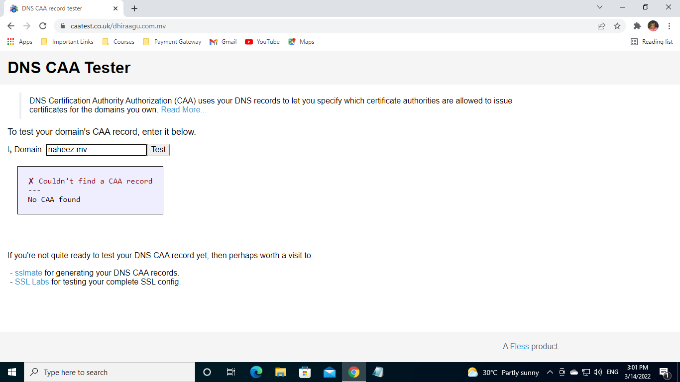 The only exception is CAA record for my domain naheez.mv which's Name Servers and DNS are in Dhiraagu and she doesn't support CAA records.