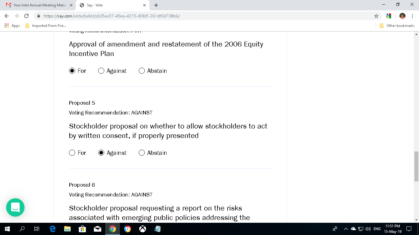 Day before yesterday night, Say Communications LLC emailed me the proxy voting materials again and I voted to elect the members of the board of directors of Intel® and other decisions on agenda...Last night I edited my votes and voted some as against in favor of Intel®s recommendations....